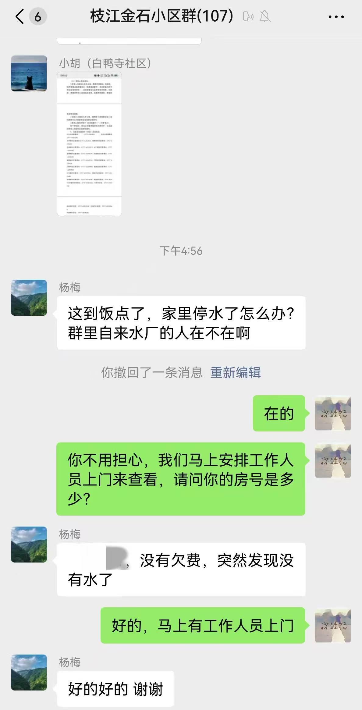 “到饭点了,家里停水怎么办?”近日,马家店街道五柳树社区金石小区居民杨奶奶在网格微信群求助,群内“水管家”立即回应:“您别担心,马上上门查看。”经现场检查,发现供水阀门出现故障,工作人员迅速进行紧急维修,从反映问题到恢复供水,整个过程用时不到30分钟。
